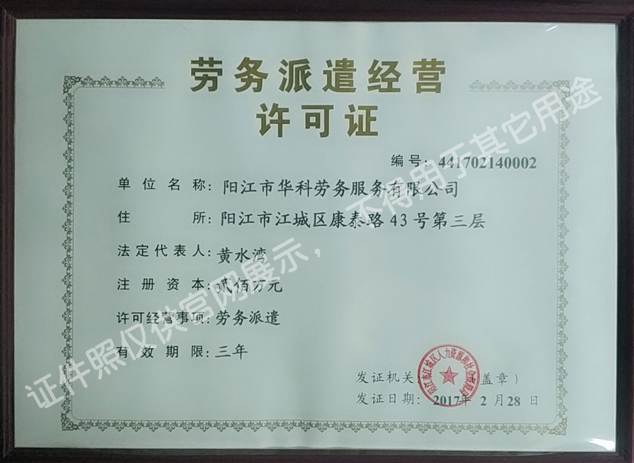 華科勞務(wù)服務(wù)有限公司是專(zhuān)業(yè)從事人事代理、勞務(wù)租賃、人力派遣及管理的綜合性服務(wù)機(jī)構(gòu),是首批獲得廣東省人力資源廳、陽(yáng)江市勞動(dòng)和社會(huì)保障局頒發(fā)人力資源許可證的合法單位。公司秉承“誠(chéng)信務(wù)實(shí)、專(zhuān)業(yè)熱情、滿(mǎn)意第一、服務(wù)社群”的經(jīng)營(yíng)理念,在勞務(wù)派遣業(yè)務(wù)的基礎(chǔ)上,更致力于合同制工人(臨時(shí)工、實(shí)習(xí)生、假期工)方向發(fā)展,為用工企業(yè)及時(shí)輸送合格的各類(lèi)人才,合理調(diào)配人力資源的有序流動(dòng),幫助求職者尋求更加滿(mǎn)意的就業(yè)渠道和崗位,切實(shí)維護(hù)求職者的合法權(quán)益。